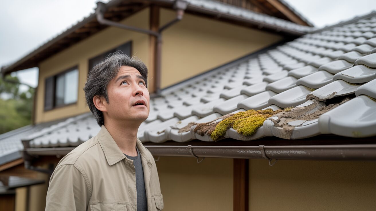 地上やベランダから屋根を見上げて、ズレ・割れ・色あせ・苔・サビ・棟板金の浮き、室内の雨染みを確認する安全なセルフチェックが有効です。